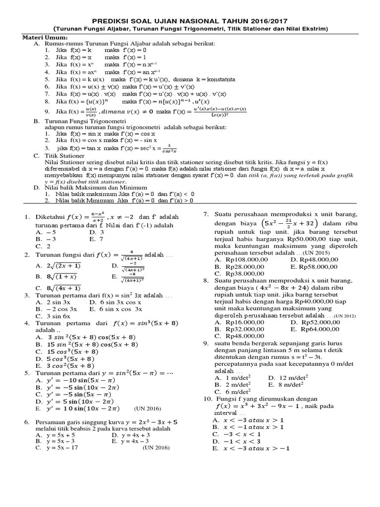 Soal Un Turunan Fungsi Trigonometri - Bab 14 Turunan Derivatif - Lebih lengkapnya, perhatikan gambar di bawah ini.